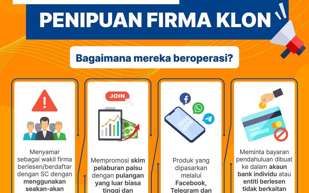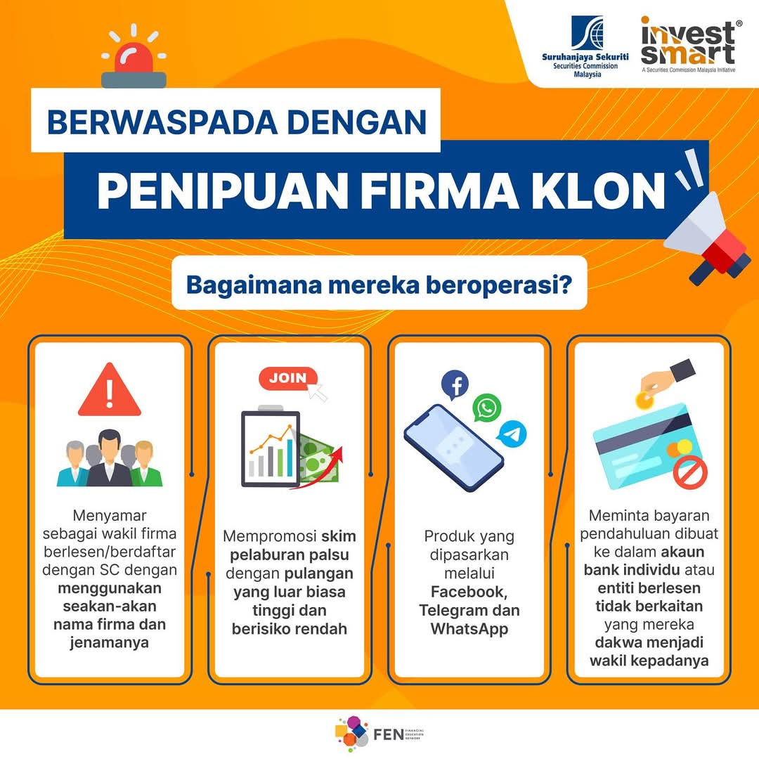 Penipuan pelaburan melalui firma klon semakin berleluasa di Malaysia, menjerat ramai pelabur yang tidak berwaspada. Firma klon merujuk kepada individu atau organisasi yang menyamar sebagai wakil sah firma pelaburan berlesen dengan Suruhanjaya Sekuriti Malaysia (SC), menggunakan nama dan logo yang hampir sama dengan firma yang sah. Modus operandi mereka sangat licik dan sukar dikesan.